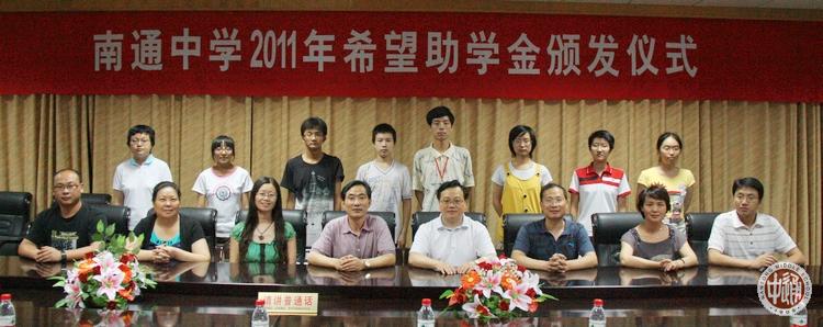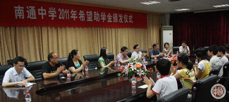 7月11日下午,我校2011年希望助学金颁发仪式在敬铭楼第二会议室举行。仪式由我校校长助理沈惠祥主持,南通市政府对台事务办公室副主任曹勇、对外联络处处长严峻陪同台胞羌永健先生的孙女羌女士一行前来我校出席了仪式。我校学生处主任杨志冲、副主任邱允莉、主任助理潘雪峰等干部出席。