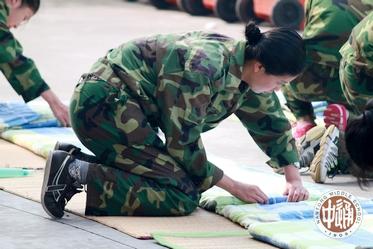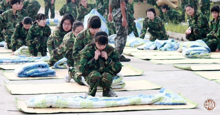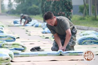 教官们蹲在席子上一板一眼的向大家演示如何叠好被子,所有同学都聚在教官旁边认真地观看学习,然后自己练习。早上的太阳晒得大家满脸淌汗。看着同学们一边擦汗一边努力学习叠被子的样子,一旁拍照的记者们也不禁赞赏。