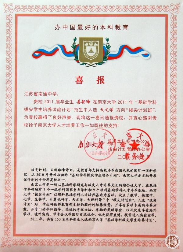 我校今年毕业生姜朝峰入选南大拔尖计划班