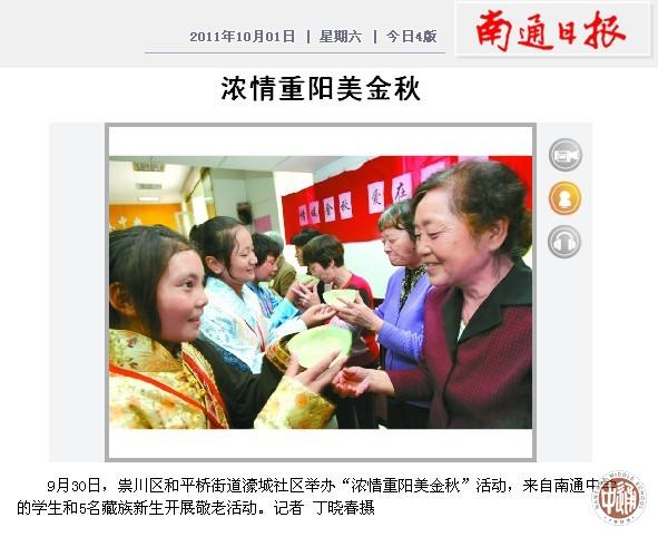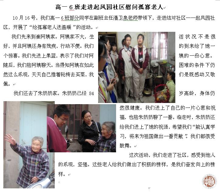 【编者按】这里编发的是高一1班洪锦艺和龙南两位同学记写的高二2班和高一1班、西藏生17班同学参与社区“情暖金秋,爱在重阳”主题活动的报道,以及高一6班“给社区孤寡老人送温暖”主题活动的报道。借此报道之机特别提醒一下:请各班来稿务必写明班级和作者,并提供原始图片与文稿一并打包投递。