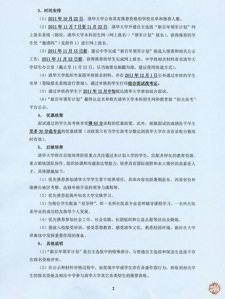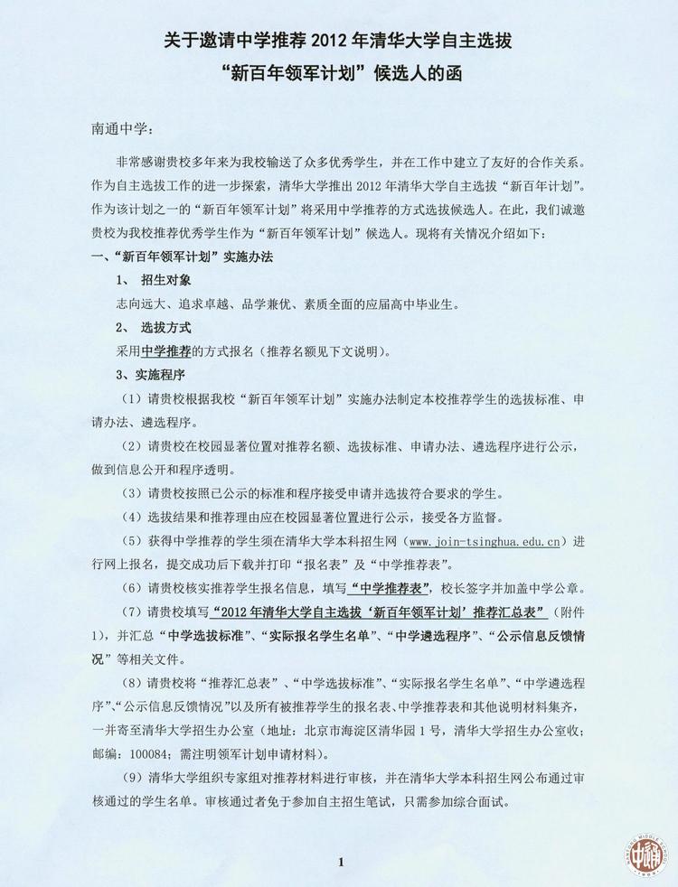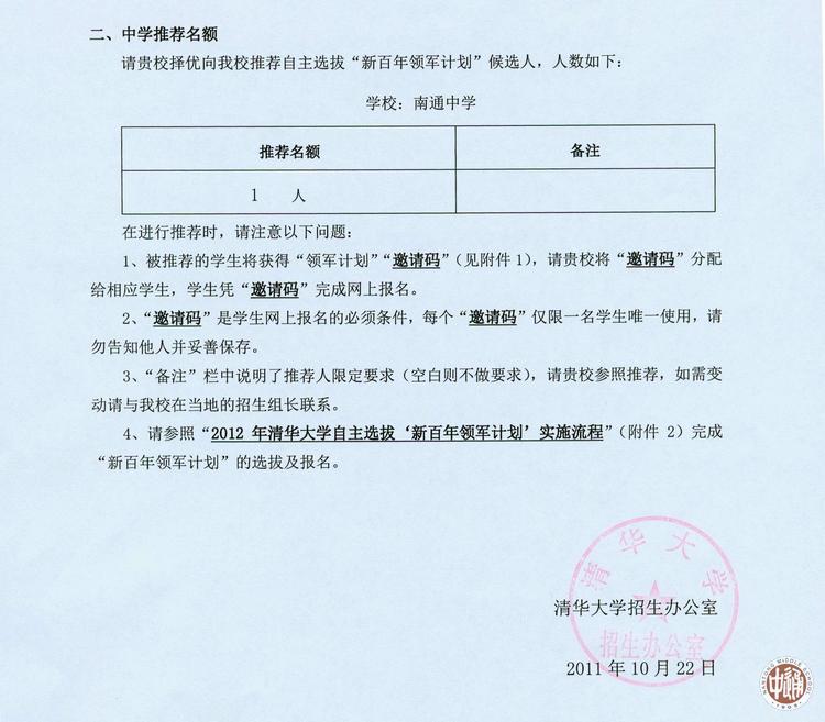 继北大10月18日贺函通知我校制定并实施“实名推荐制”方案后,清华大学于10月22日致函热情邀请我校推荐2012年清华大学自主选拔“新百年领军计划”候选人。以下是邀请函全文。 此外,自今年起,清华大学在全国各地挑选优秀中学确认为“新百年领军计划”优质生源基地,我校是首批被确认的优质生源基地。 |