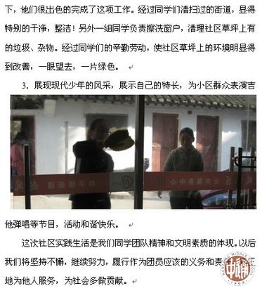 高一6班“服务社区争做文明少年”主题活动 来源:本站原创 发布时间:2011-11-30 14:47:26 浏览次数: 次 【字体:小 大】 【编者按】排版有特色,所以就直接截屏贴在这里了。以后来稿务必将照片原稿一起附来。谢啦! 分享到: 【打印正文】