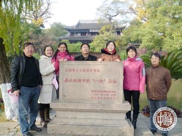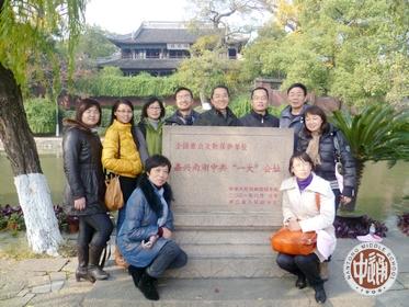 下图为参加活动的党员在南湖烟雨楼“一大”会址前合影留念。