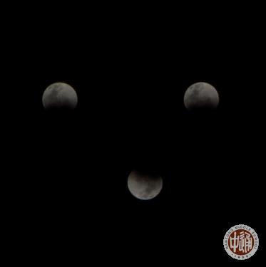 还有一位高三会员估计是瞒着家长溜出来拍月亮的,执着地不肯让编辑在报道中留名,说是面临高考怕被大人责怪不用功。真难猜到究竟他是怎么哄得家长相信的。他用普通数码相机(非单反)多次曝光特技拍了下面的两幅“笑脸”组图。