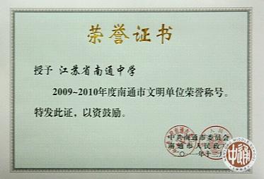 根据南通市精神文明建设指导委员会办公室1月9日文件《关于领取南通市文明行业文明村文明乡镇文明社区文明单位和文明社区共建工作先进单位牌匾证书的通知》(通文明办[2012]2号),2009-2010年度南通市文明评选结果已经揭晓,我校获评2009-2010年度南通市文明单位称号,并获得中共南通市委和南通市人民政府颁发的文明单位牌匾和证书。