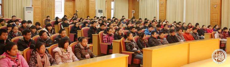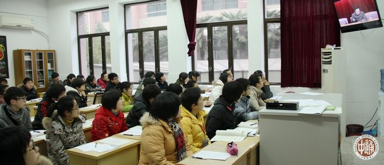 学期结束校会于1月16日上午召开,主会场在图书馆报告厅,全校各班在教室收看实况转播。 会议由校长助理沈惠祥作学期教育工作总结。 以下各图分别是主会场出席校会的学生代表和教室里收看转播的学生。 |