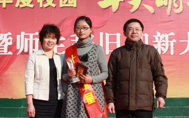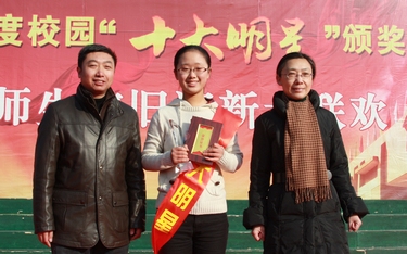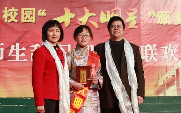 十大明星最后一个登台的是获得“诚恒之星”称号的高三8班任诗琦同学(右上),给任诗琦颁奖的是南通中学学生处主任、南通市中青年科学技术带头人、南通市学科带头人陈建云老师和南通市中青年科学技术带头人、南通市学科带头人、南通中学政治教研室主任周建民老师。