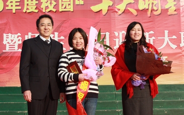 2009年12月31日,南通中学全体师生聚集操场,举行隆重的2009年度校园“十大明星”颁奖典礼暨师生辞旧迎新大联欢。今天的主持人是(下图左起)高二11班朱彦頔、高二8班周舒、高二12班王姗姗、高一1班薛可。