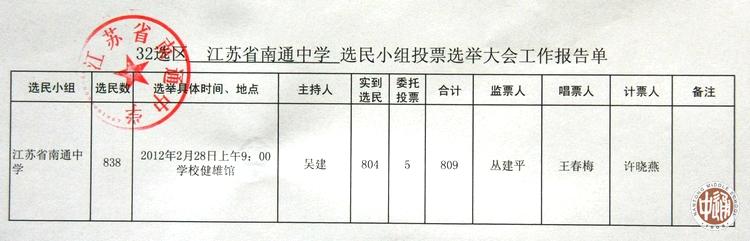 崇川区第八届人大代表第32选区江苏省南通中学选民选举于2月28日上午在健雄馆举行。全校教工选民和年满18周岁的学生选民总数838人;其中本次选举实到选民804人,委托投票5人,占选民总数的96.5%。以下是投票现场报道。