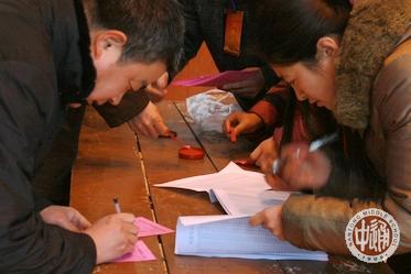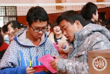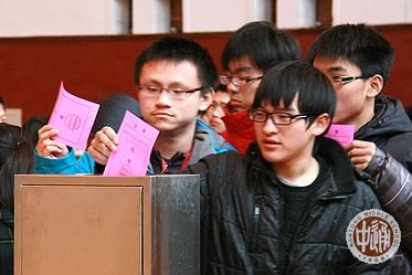 下左图:班主任现场指导填票;下右图:一位同学正仔细研究选票,旁边那位已经垫着她的肩膀开始填票了。