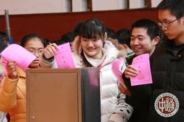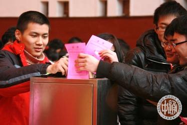 下图:上午9:25,刚下第二课的学生选民进场,选举工作领导组成员、学生处主任杨志冲(前侧影者)现场巡视。