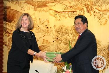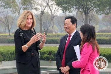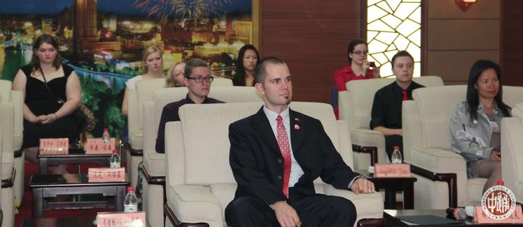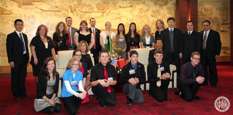 上图中的美国姑娘怎么看都像是在舞蹈;右图中的美国男孩就像模像样了,估计他们以为只要将搏击时的双拳变换成双掌就是中国功夫了吧。 以下各图是3月27日上午南通市人民政府接待马科姆郡中学生访问团的场景。次日,南通网以《美国马科姆郡中学生交流团访问南通》为题报道了该活动,网址如下: |