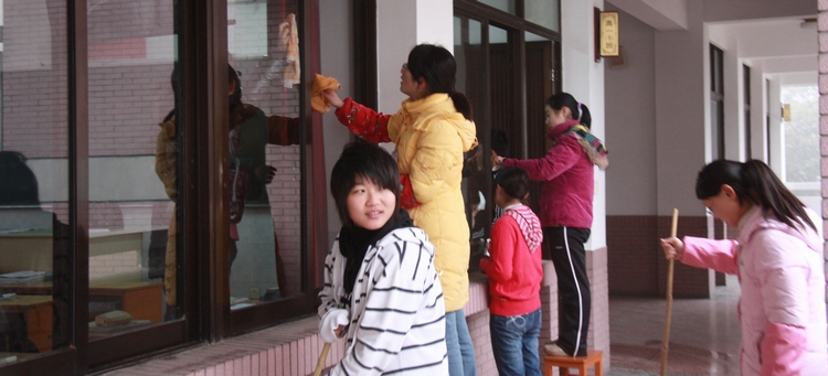 来得早的同学已经开始洒扫庭除,下图那个班主任正在一丝不苟地检查同学们的工作质量。
