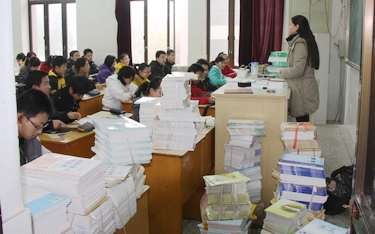 上图男生们正在校图书馆排起长队等待领取课本;下图会议室临时改用作会计室,班主任和班干部们正向上门服务的银行工作人员解款。