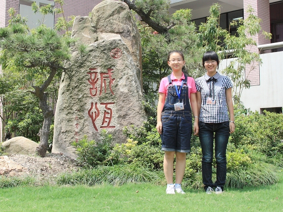 上图是我校陈风雷老师现场领奖的镜头,下图是获奖同学徐冰妍(左)和黄嘉莹(右)在通中校园“诚恒”校训石前合影。