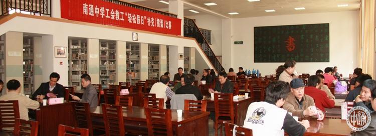 4月7日星期六下午,我校工会组织的教工“轻松假日”扑克(掼蛋)比赛在图书馆二楼阅览室举行,教工扑克爱好者以工会小组为单位组成十个队参赛,每队6名选手。各队抽签后有四支参赛队预先进行淘汰赛,胜出的两队与其他六队进行八强淘汰赛,胜出者进入四强赛。