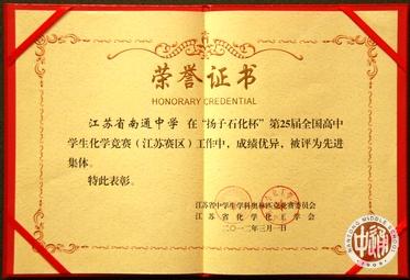 江苏省中学生学科奥林匹克竞赛委员会和江苏省化学化工学会于今年3月联合表彰“扬子石化杯”第25届全国高中学生化学竞赛(江苏赛区)先进集体,我校受到表彰并获第25届全国高中学生化学竞赛(江苏赛区)工作先进集体荣誉称号。 此前,我校曾于去年10月报道了我校沈天宸朱剑峰两学生获化学竞赛国家一等奖的报道,相关网址如下: |