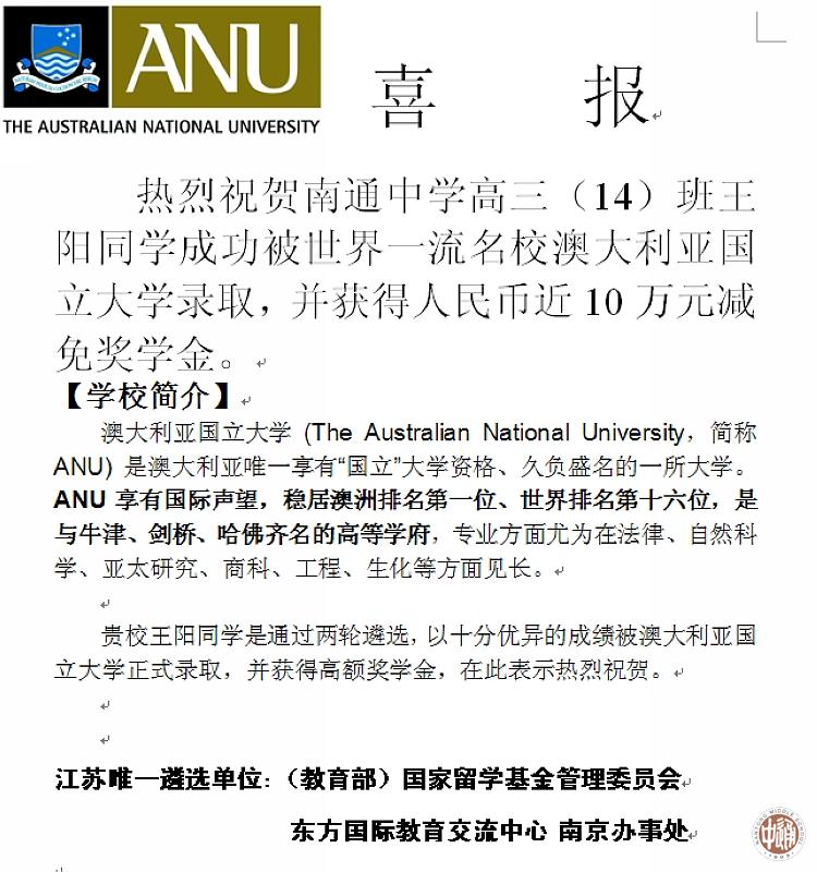 我校昨日收到国家留学基金管理委员会发来的关于我校前影评协会主席、高三14班王阳同学(右图)被世界一流名校澳大利亚国立大学录取的喜报。我校师生热烈祝贺王阳同学获得的优异成绩,并希望王阳同学再接再厉争取更大进步。 此前4月11日我校举行高三年级学生成人仪式,当晚王阳同学发函班主任冯琴老师致谢。信函摘录如下:谢谢您几年来对我的关爱和帮助,谢谢您不厌其烦地为我讲解数学题目,谢谢您的鞭策和鼓励~~祝您永远这样美~~ |