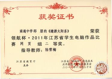 陈阳洋同学的作品《班级图书角小助手》获程序设计组一等奖;谈浩同学的作品《南通中学高一5班篮球队形象设计》获电脑艺术设计组二等奖;邵朋同学的作品《遨游太阳系》和陆维同学的作品《拍吧》分别获网页组二等奖和三等奖。