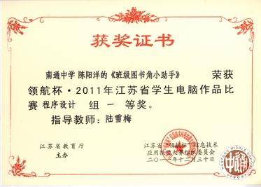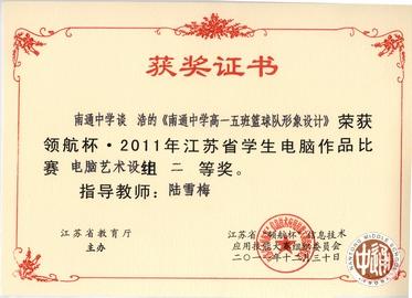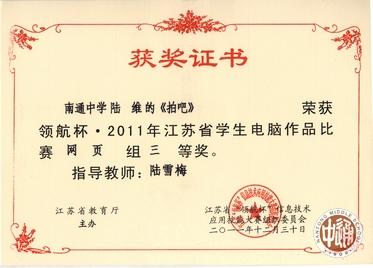 由江苏省教育厅主办“领航杯”2011年江苏省学生电脑作品比赛于2011年10月进行,比赛结果于当年12月30日确定。近日,我校收到参赛学生的获奖证书,名单如下。