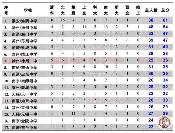 从各校入围人数来看,扬州中学以48人排名第一。从各校总分来看(清华、北大每人次计2分,其他高校每人次计1分),淮阴中学以61分排第一,扬州中学54分排第二,海门中学、苏州中学并列第三;接下来的排名是盐城中学、靖江中学、徐州一中、南通中学、启东中学、南师附中。