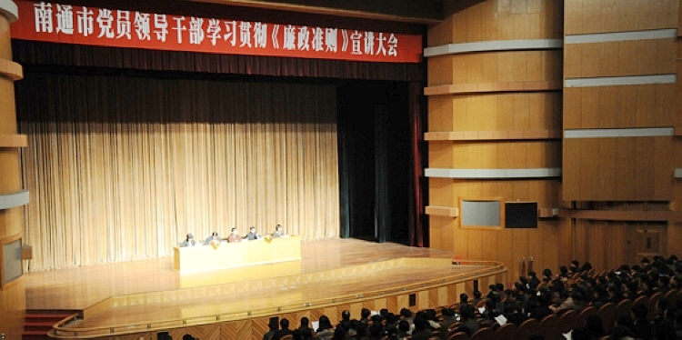 3月18日上午,根据市委《学习宣传贯彻<中国共产党党员领导干部廉洁从政若干准则>的通知》精神,市纪委、监察局在更俗剧院举办了全市党员领导干部学习贯彻《廉政准则》宣讲大会,我校党委全体委员和中层以上党员干部22人出席了大会(下图)。