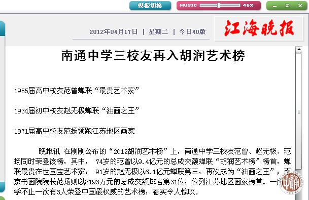 4月17日《江海晚报》J4版头条位置以《南通中学三校友再入胡润艺术榜》为题报道我校校友范曾、赵无极、范扬三位艺术家的骄人艺术业绩。全文详见以下网址: