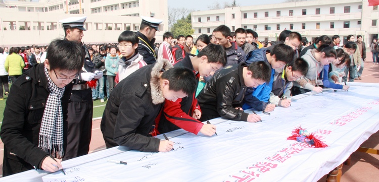 上图学生会体育部长从交巡警大队长手中接过“交通文明志愿者”旗帜,下图同学们在誓词横幅上签字。