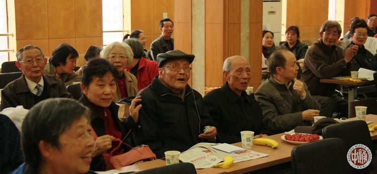 上图出席活动的离退休老教工对精彩发言报以热烈掌声。下图左起:八十岁以上老教工代表王昭华为大家朗诵本人创作的祝寿诗歌,陆刘华代表工会致辞,艺术学科特级教师蒋维正在主持文艺表演,老年大学学员独唱表演。
