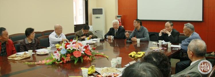 我校党委书记韩明飞(下图发言者)应邀出席聚会,并向前辈校友详细汇报了近年来我校教育教学取得的成绩和学校建设等各方面的发展情况。坐在韩左手的清瘦老者是林祥棣院士,右手的白发较胖老者是居玉鑫院士。因工作特殊,两位院士至今仍未退休。