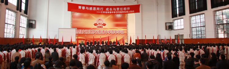 4月16日下午,学校体育馆,主题为“青春与感恩同行,成长与责任相伴”的江苏省南通中学2010届学生成人仪式在嘹亮的国歌声中庄严开始,通中本部和崇海高中全体高三年级学生出席了仪式。