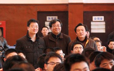 1983届校友、今日高三学生的家长徐锋(下左)代表全体家长衷心祝福大家,勉励大家终身做一个合格的公民;崇川区人民检察院副检察长、我校法制副校长程玮(中)向全体年轻公民宣讲宪法;校党委书记韩明飞(右)殷切希望全体同学用自己的辉煌人生为母校增光。