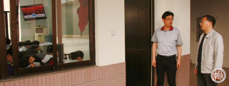下图学生处主任杨志冲和教务处主任助理顾军在高三教学楼现场巡视。