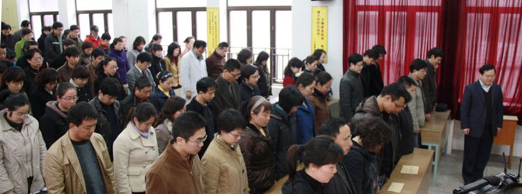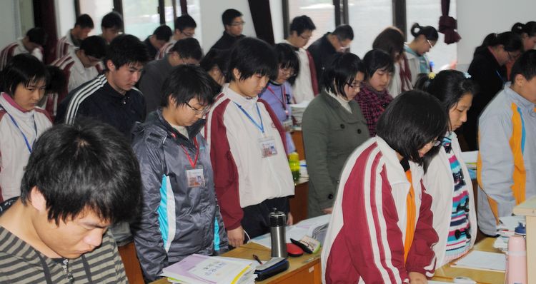 上午9:30,阴雨凄凄,通中全体师生在教室里默哀、捐款。