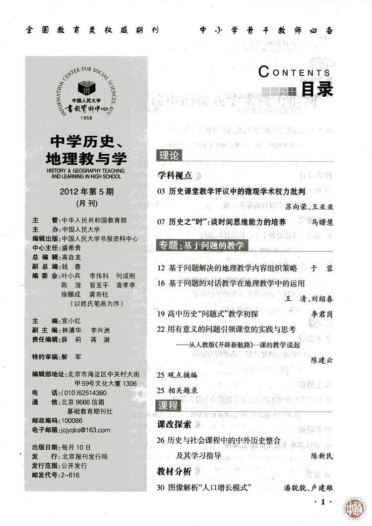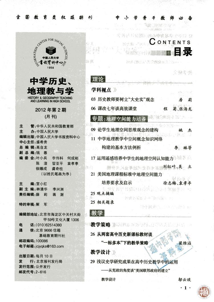 其中,范从华的《高中历史“问题—探究”式课堂教学模式初探》(原载《中学历史教学研究》2010.1/2.43~47)被全文转载于《中学历史、地理教与学》2011年第10期。 邬云琰《浅议史学研究成果在高中历史教学中的运用》(原载中文核心期刊《教学月刊:中学版》2011.11.5~7)被全文转载于《中学历史、地理教与学》2012年第2期。 陈建云《用有意义的问题引领课堂的实践与思考》(原载《中学历史教学参考》2011.12.53~55)被全文转载于《中学历史、地理教与学》2012年第5期。 《人大复印报刊资料》系列杂志与北大中文核心和南大社科核心不同,它的数据库以其涵盖面广、信息量大、分类科学、筛选严谨、结构合理完备,而成为国内最有权威的,具有大型、集中、系统、连续和灵活五大特点的社会科学、人文科学专题文献资料宝库。我国各大高校及科研单位都以本年度论文被《人大复印报刊资料》转载数量之多为荣。人大复印资料收录的论文数量不仅是高校学术排名的重要指标,也是原载文期刊被遴选为全国中文核心期刊的重要依据。 |
