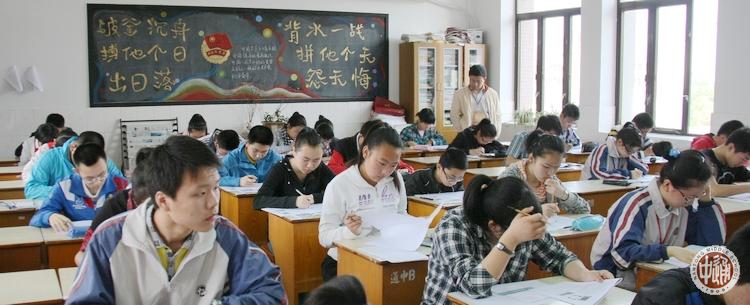 上图笔试考场恰好是高三年级教室,座位后面黑板上“破釜沉舟搏他个日出日落,背水一战拼他个无怨无悔”的口号把这年头学生的应试心态表现得淋漓尽致,将来编写校史的老师面对这幅图片定会感慨万千。