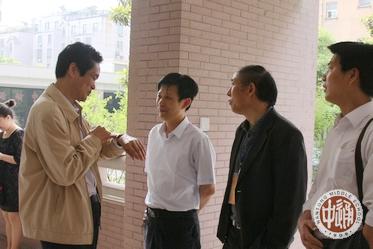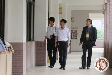 上左图市局纪检监察室主任冯斌正在考点现场向姚天勇了解情况,上右图韩明飞陪同冯斌视察考场。