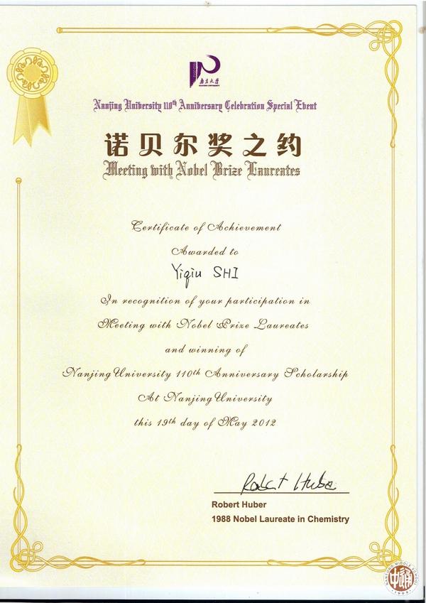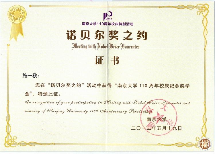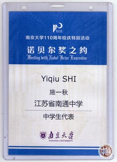 在本网站5月26日的报道《南通中学五位学生赴“诺贝尔奖之约”的感悟》一文中,同学们读到施一秋文中的下面这段记叙: “在‘诺贝尔奖之约’活动中,通中学子大放光芒。我与章小雨录制的感言视频‘大学•大师’入选南大诺奖之约活动形象宣传片,向四位诺奖得主和嘉宾现场展示。” 一些读者非常希望本网站播发这段视频。经了解,这段视频是由南大校庆筹备部门拍摄的,人民网以《“跨越之声”系列对话:“诺贝尔奖之约”》为题转播了这段视频,网址链接如下。 http://tv.people.com.cn/GB/43911/17895081.html 顺便展示一下我校学生(以施一秋为例)赴诺贝尔奖之约活动的身份牌(右图)、证书和诺奖大师签名的纪念卡(以下两图)。 |