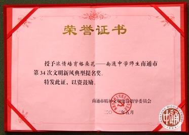 6月5日《南通日报》A5版报道了市文明委关于表彰南通市第34次文明新风典型的决定(通文明委[2012]2号)。 该决定表彰了24名获“文明新风典型奖”的集体和个人,另表彰了7名获“文明新风典型提名奖”的集体和个人。我校获“文明新风典型提名奖”。 |