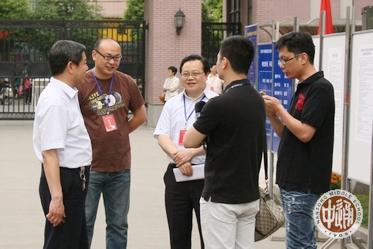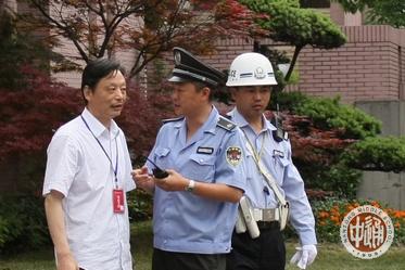 下左图考场外考点副主任许建平正与负责考点安全的城管干部交换信息;下右图考点副主任沈惠祥正向南通电视台记者介绍情况。下午4:30监考人员指挥考生离开考场,组织英语试听人员签字,然后监考员将考场钥匙送缴主考室,后勤组关锁各考场门窗、张贴封条。高考全部准备工作完毕。