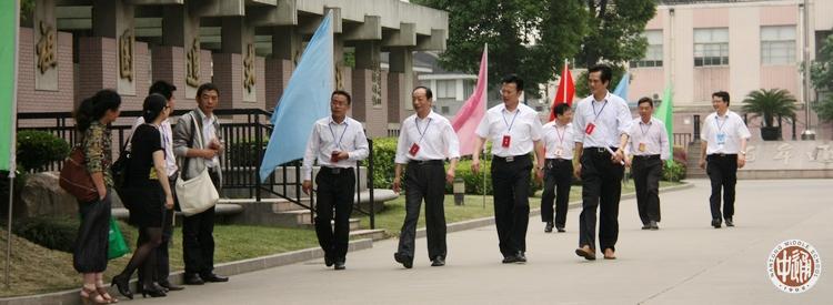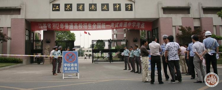 下午4点钟左右,南通市人民政府副市长杨展里(下图正面左二)在市教育局局长郭毅浩(左三)陪同下来通中考点检查高考准备工作。