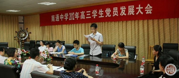 6月14日下午,南通中学党委学生工作支部召开2012年高三学生党员发展大会,支部全体党员、高三学生新党员发展对象以及他们的入党介绍人和党员教师代表出席了会议。