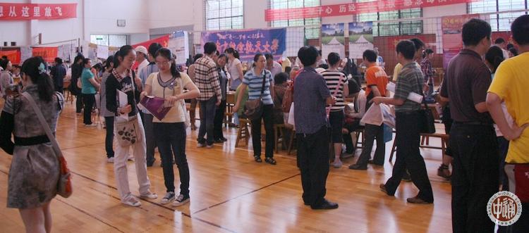 咨询会地点在我校健雄馆。大厅主席台前悬挂着各高校招生简章和宣传画,主席台下三个排球场的球网将大厅分隔为左右两个区域,球网两面和大厅两侧墙上挂满各高校宣传横幅和招贴画,招贴画前是各高校招生工作组临时接待处。