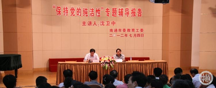 7月4日下午,中共南通市委教育工委在南通高等师范学校报告厅举办“保持党的纯洁性”专题辅导报告会,教育工委书记黄建辉主持,中共南通市委党校副校长沈卫中主讲,市局直属学校和单位代表出席。