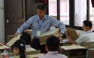 于此同时,我校两个主考室内监考人员已经在分发各考场试卷和答题卡(上图和右图),由我校两位副校长担任的主考官与全体监考人员仔细核对全部考场文件,并再次重温监考程序。 考前半小时,监考人员已全部进入考场(下图)。 |