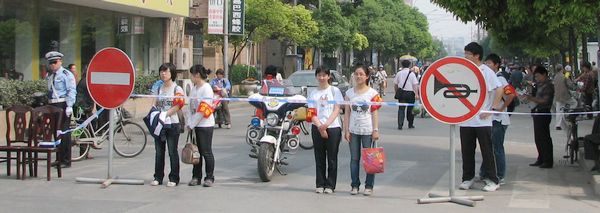 下图是担任协勤志愿者的我校高二3班同学正与考点外的交警一起管理交通,为考场内的师兄师姐们站岗放哨呢。 |