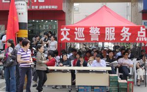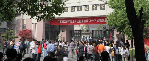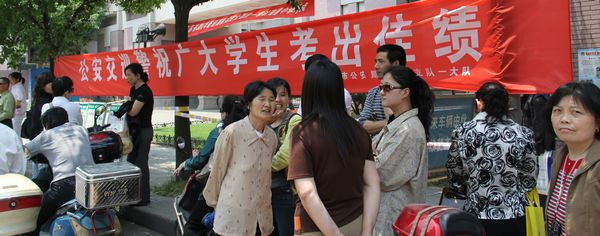 年年今日都是考生家长们最焦虑的时候。孩子们十年寒窗,能否登上人生满意的台阶,就看高考了。 右图坐在考点外交巡警服务点的家长默默等待着,下图几位母亲正在交流前些日子为孩子复习迎考而采取的措施和经验。通中考点衷心祝愿全体考生取得最佳成绩! |