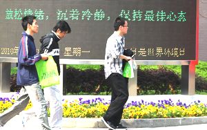 考生亦开始进场。下图中考点内的电子屏上打出了给考生的温馨提示:放松情绪,沉着冷静,保持最佳心态。巧的是,电子屏底栏保留的纪念日提示语“6月5日是世界环境日”与今天江苏高考作文题“绿色生活”正相呼应。 |