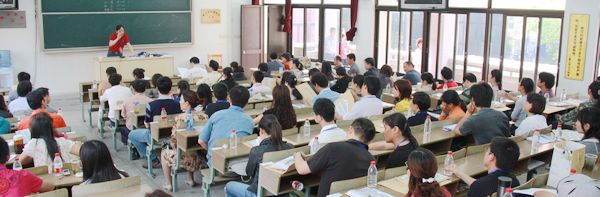 上图通中健雄馆也用作考生休息室,台上巨幅幕墙已提前打出2010届高三毕业典礼的会标,强烈地渲染了高考气氛,预示今年考生圆满成功。 |