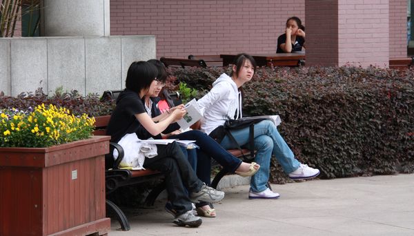 上图这位送考老师是教英语的,正尽职尽责地给考生上最后一课。下图几个坐在校园长椅上的女生,考毕也会读到今天这篇报道吧。把这张照片下载保存好呵,难得的青春的记录呢。 |